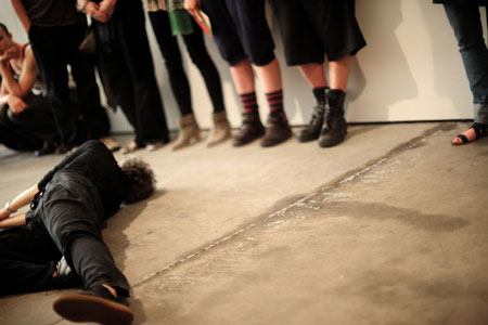 Straddling alongside both walls, as if commuters awaiting the imminent arrival of a train upon a platform, the crowd lies in wait. Click. They anxiously and repetitively consult their wrists as if distrusting of the movement of their timepieces or the electronic digits representing the passing of time. Click. They randomly scan one another, as if waiting for one of the crowd to reveal themselves as something they are not. Click. They fidget and shuffle from side to side as if uncomfortable within their own skin, yet cautiously enough so as not to encroach upon the abyss they have created across the gallery. Click.